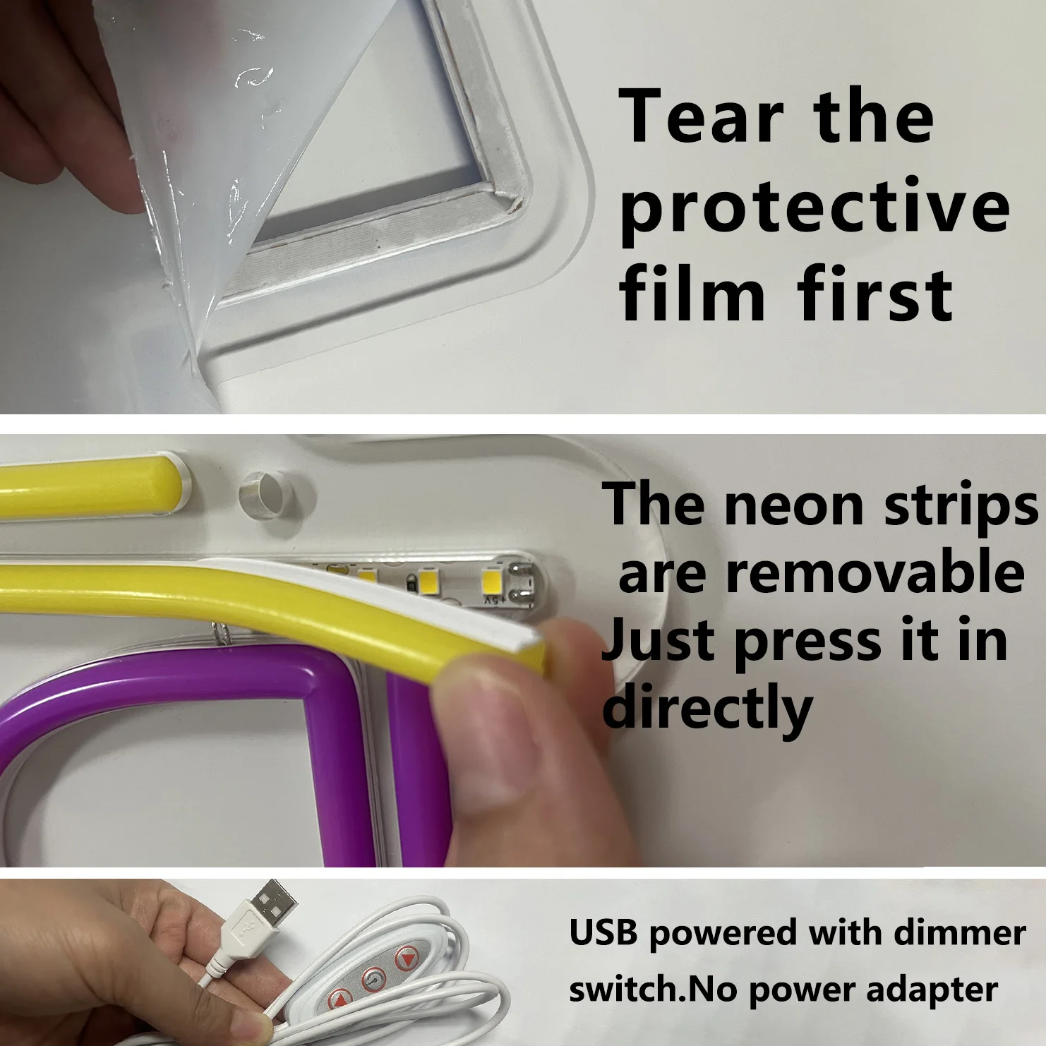 Some neon signs received will have tape with edges to protect the acrylic board from being scratched during transportation, so please tear off the tape on the acrylic board before using the neon sign